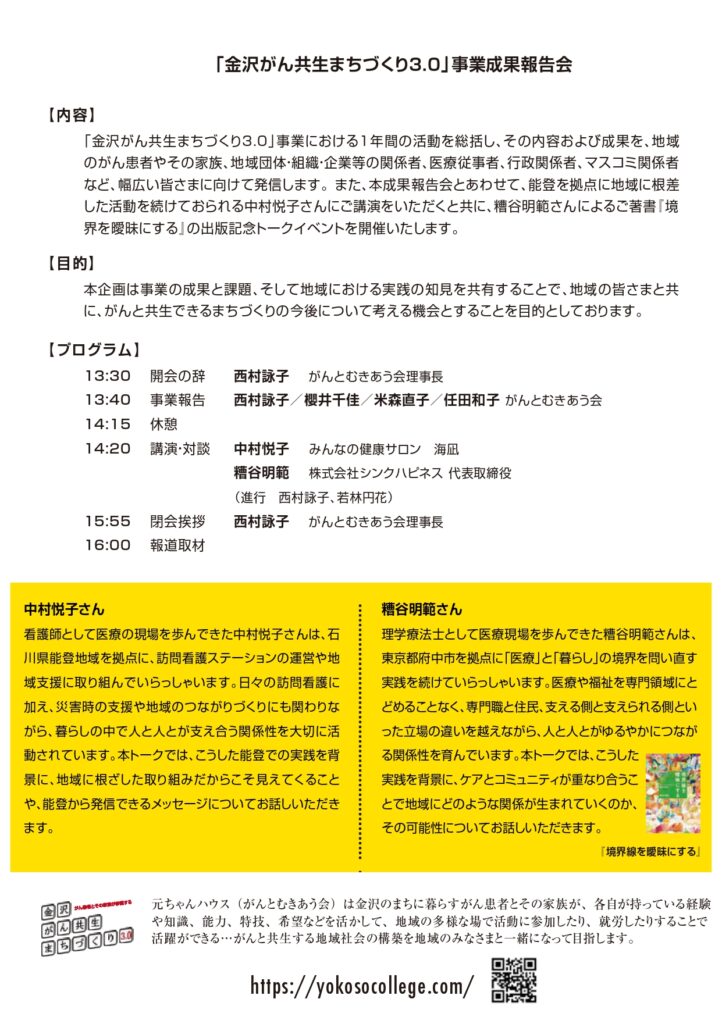 3月28日石川県立図書館だんだん広場で成果報告会とトークイベント開催 2026 3/09 お知らせ 2026年3月9日 お知らせ よかったらシェアしてね! URLをコピーしました! URLをコピーしました! 「病気を抱えとる時のいろんな思いと、どう付き合えばいいがやろ? チャップレン・圭くんと臨床宗教師・洋三くんの対談」開催